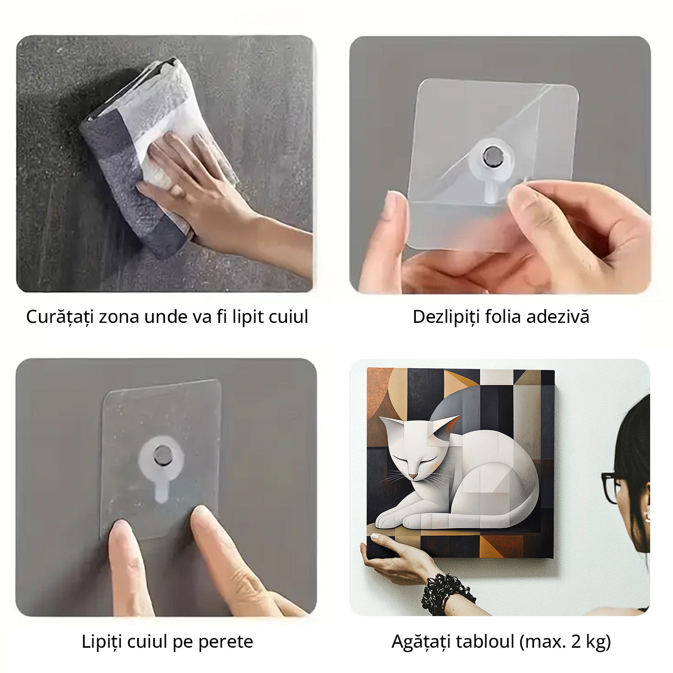 Pachetul include agatatoare si sistem de prindere cu dublu adeziv pentru perete. Nu aveti nevoie de nimic in plus pentru a va bucura de tablou imediat ce il scoateti din colet.
